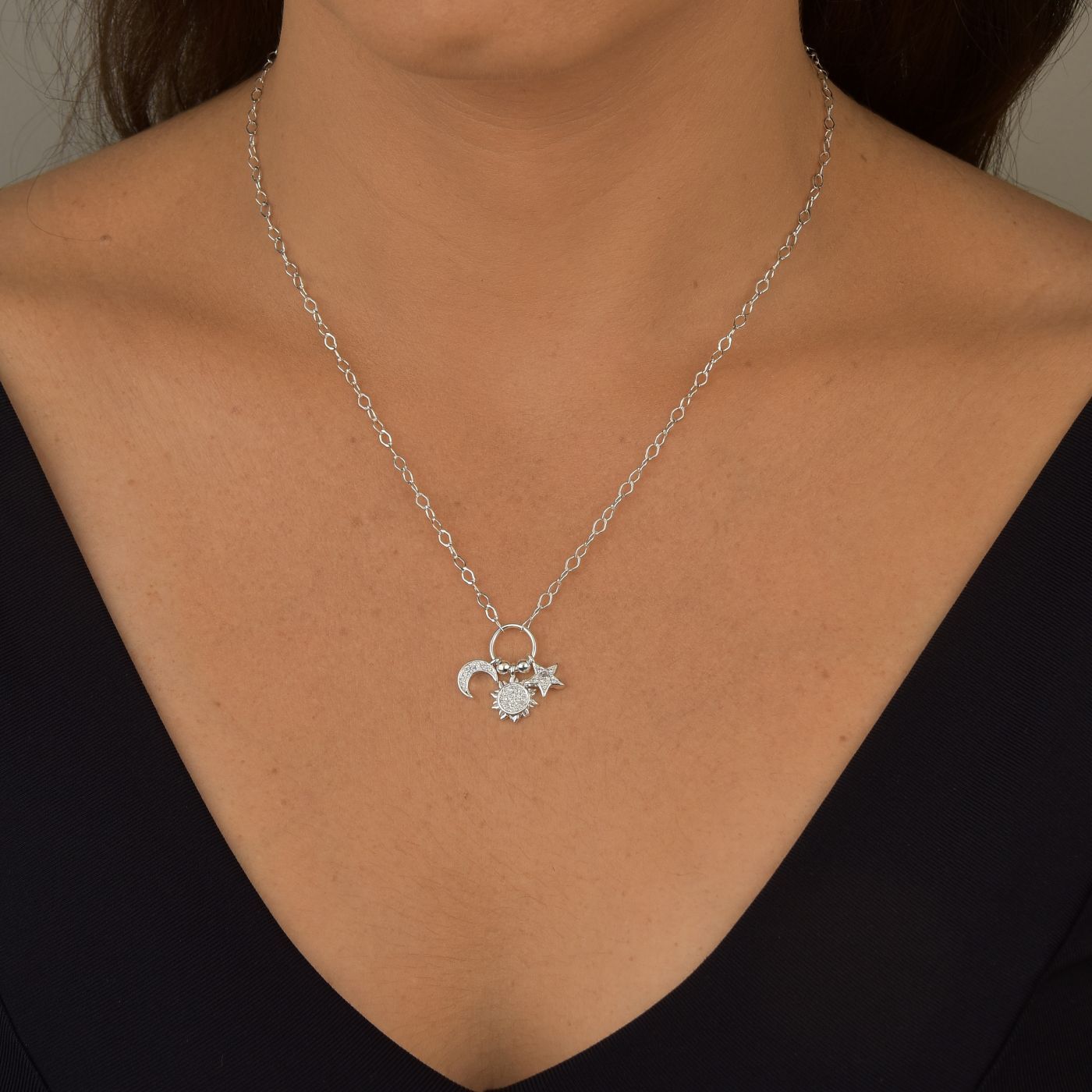 O Colar Sol, Lua e Estrela em Prata 925 une brilho e significado em uma única peça. Com pingentes detalhados que representam luz, harmonia e proteção, ele traz um toque celestial ao look. Moderno e delicado, é perfeito para usar no dia a dia ou compor mixes cheios de personalidade.