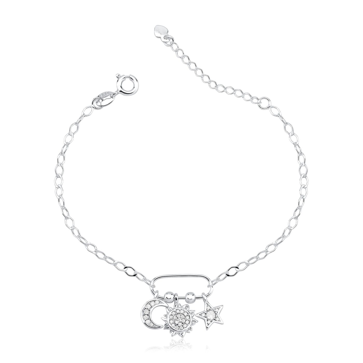 A Pulseira Sol, Lua e Estrela em Prata 925 combina brilho, delicadeza e significado em uma única peça. Com pingentes que representam luz, proteção e energia, ela traz um charme especial para o pulso e ilumina qualquer look. Perfeita para quem ama acessórios cheios de personalidade e simbolismo.